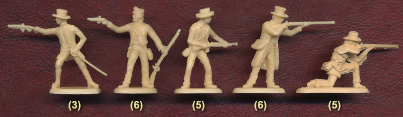 Joining the Texian volunteers were several whole volunteer units. Most famous of these was the New Orleans Greys, a unit from the USA that clothed themselves in all-grey uniforms found in local stores before they left for Texas. Three such figures are included in this set, with a uniform that was much like the uniform of the regular US army in all but colour. In addition, the man with the red hunting shirt belongs to the Alabama Red Rovers, another unit from the US that managed some uniformity.