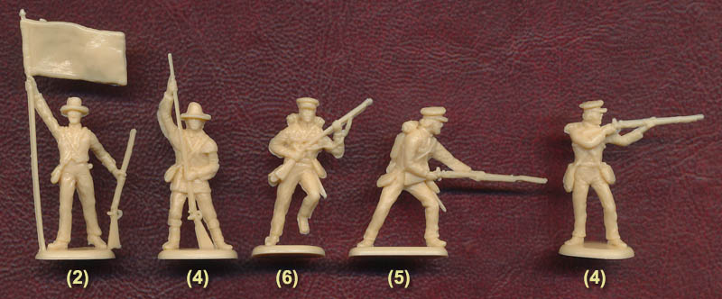 A fine array of figures, all of which are very well carved and accurately detailed. The balance between uniform and 'civilian' dress is about right, and the poses are good too. The inclusion of the personalities clearly leaves less poses for the rest of the men, yet all four are wearing fairly ordinary costume and could easily be used as common soldiers as well. We found no flash on our example of this set, so in all respects these are very well presented figures.