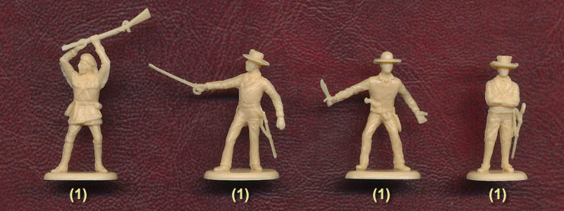 With a battle that had more than its fair share of larger-than-life characters, it is fitting that IMEX should include some of these in their set. The four figures on the bottom row all represent such individuals, and moving from left to right they start with the instantly recognisable figure of Davy Crockett. Crockett was famous well before the Alamo, and sometimes wore frontier garb such as depicted here. However contrary to popular legend he usually dressed in conventional clothes, or 'like a gentleman and not a backwoodsman'. The evidence for his appearance at the Alamo is contradictory, but does not seem to suggest the buckskins we see on this figure, which is perhaps more to do with what people imagine he looked like than the reality. In any case, this figure could also serve for other anonymous men dressed in this manner. Next is Lt. Col. William Travis, who commanded the garrison, and beside him is Jim Bowie, who was in command of the volunteers at the Alamo but was too ill throughout the siege and battle to take any active part, despite his healthy appearance in this set. Finally there is Sam Houston, commander of the Texian forces, who was not at the Alamo and consequently lived to achieve the independence of Texas after the battle of San Jacinto.