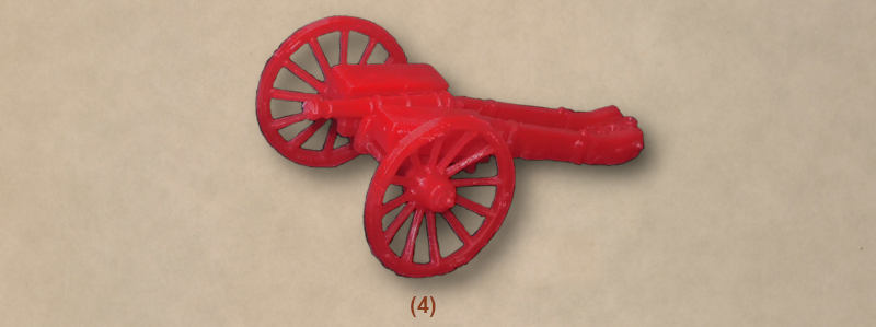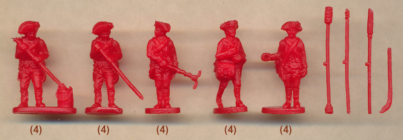 The sculpting of these figures and gun is what we would describe as ‘soft’, meaning the detail is there but not sharply defined, and smaller elements are hard to make out at all. So for example most of the men have some long item on the pouch belt which should be to hold vent prickers and a small hammer, but here it is impossible to make out at all. Faces are adequate but hands have little suggestion of fingers, and there has been no attempt to show the inner parts of the tricorn hat behind the turnups, which are therefore just solid plastic, even though on some poses this is accessible to the mould. Although there is a hole in the hand of the last man, and pegs on each of the separate tools, the fit is poor and gluing is required in all cases. There is some flash, but not too much, and apart from the hats there is very little excess plastic in unreachable places. The gun is assembled using the conventional pattern of carriage, two wheels and barrel, plus the two ammunition boxes, and these fit to a point, but we found that the wheels and one of the boxes tended to spring off again when placed on the peg. This is because flash in the hole makes the fit too tight, and as a fairly soft plastic has been used for this set, the result is the peg can fit in the hole, but not stay there, so some trimming and cleaning is required to complete the assembly. Once done, however, the resulting model is quite nice.
