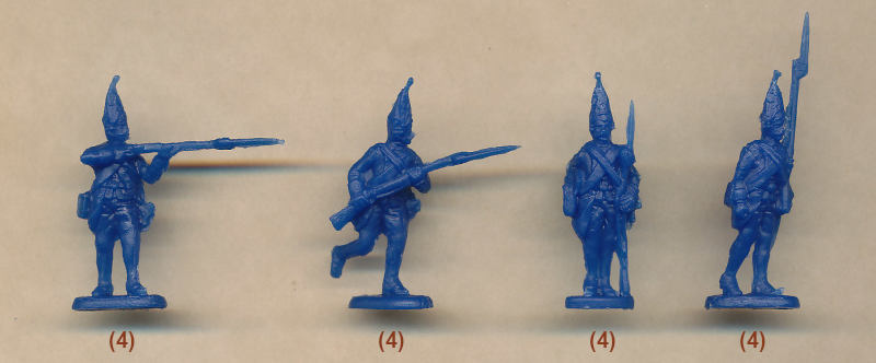 Like the other sets of Hessians produced by HaT at the same time as this one, the sculpting is very much on the ‘soft’ side when it comes to detail, so these are not good to look at. For example, although all the mitre caps have an engraved front plate, it is impossible to tell what design this is, and the faces are particularly bland, saved only by the presence of moustaches on all except the officer. The sword held by the officer is noticeably too short – the blade is 9.5 mm long (68.4 cm) when the real thing was around 83 cm in length, and the difference really shows. Grenadier companies had fifers rather than the hautbois, so it is good to see a fifer in this set, but amusingly the designer has not understood how this instrument is played, and so the fife is wedged under the nose of the unfortunate man rather than just below the mouth, where it should be. It is pleasing to report that in many areas flash is very minimal, but some seams are less clean than others, and there are a few areas of excess plastic between musket and body.