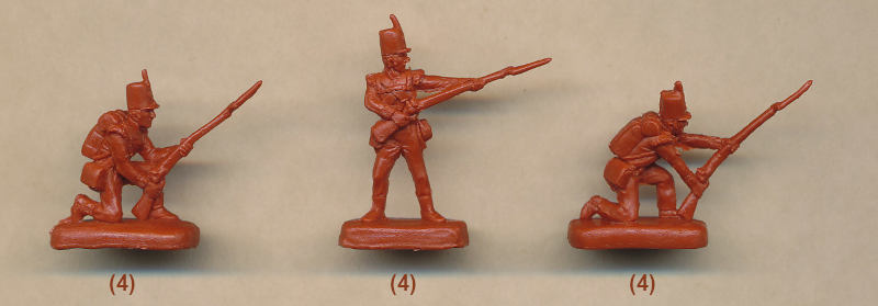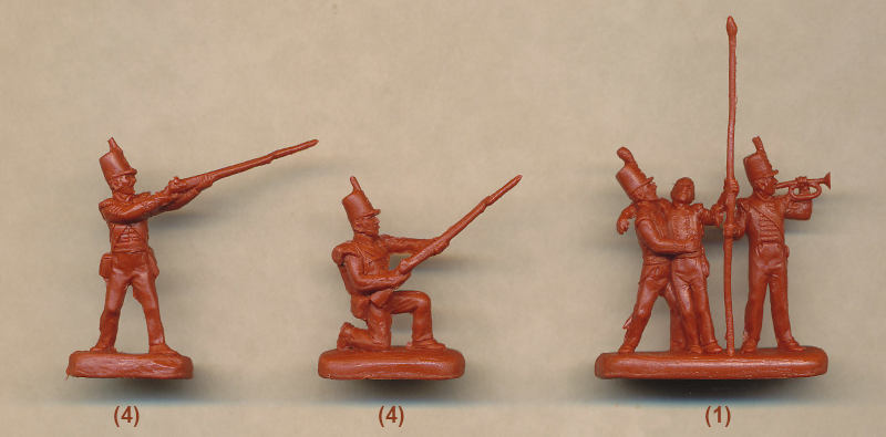 This is one of several sets by Strelets on Napoleonic British light infantry, all of which are presumably sculpted by the same hand as the style and quality is much the same. The proportions and detail are both good, but can be a bit clunky in places. Faces are quite good but hands are sometimes a bit vague, and occasionally things can get into quite a mess, as for example the left hand of the ensign. However, from a distance they will look fine, and while there is flash, it is not particularly bad.