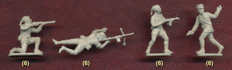 Right from the start we must say that six poses are just not adequate for any infantry set. Many people complain about sets of eight poses, though such sets often match up with others to provide a broader range of figures. The provided poses are the standard World War II stuff, but only six poses means much is missing. For example, there is no advancing figure here. The prone machine gunner (which looks to be the standard Breda M1930) is not looking forward, so cannot be firing his weapon, and the officer would perhaps also be improved by looking forward rather than to the side.