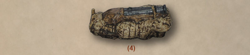What is clear is that when the guns were used, it was against a castle or fortification, and not as an anti-personal weapon on a field of battle. When purchasing European guns they were mostly the ordnance to be found on board visiting ships, and generally just the barrels changed hands. This left the Japanese to mount the barrels as they wished, and it seems perfectly reasonable that some ended up like the example in this set. This one has been attached to a wooden bed and mounted on bales to give it the necessary elevation, but of course it is not mobile at all unless carried. This did not matter for a siege, and when the gun needed to be realigned, or returned after a particularly violent recoil, all that was required was an adjustment to the bales. A contemporary illustration of just this sort of arrangement confirms the practice, which makes sense anyway. The barrel has no trunions, and is about 19 mm (137cm) in length. It seems rather flattened to our eye, although as much of it is obscured by the wooden bed it is hard to see, so it was a fairly crude weapon but this seems a perfectly likely model of how one may have appeared at the time.