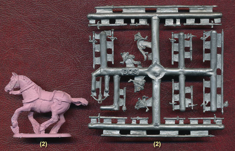 All the horse furniture in this set looks authentic, and some of the heavier examples have much engraved decoration which looks good. The saddles are very good, with a range including some with high saddle-backs and large curved front pommels (best for those with the couched lance). The liberal use of strategic tufts of grass means every animal is firmly anchored to their base, but some of the poses leave a lot to be desired as they look very unnatural. The horses themselves are not especially well done either, with some odd shapes in places.