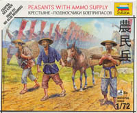 Sets that represent the logistics of a military campaign are few and far between, yet such support services were vital for any army that hoped to achieve victory in the field. Since this and other Art of Tactic sets are small-scale and intended for gaming, it is much more likely that they will cover such important but less glamorous subjects, and so we find these Japanese peasants. One is carrying a basket which could contain anything, while a second leads a pack animal with two similar baskets. The third man is clearly carrying a bunch of arrows, and of course the intention is that ammunition is the burden of all three. Since Japanese quivers held relatively few arrows, such resupply was particularly imperative for the archers.