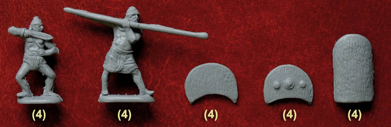 Each of the four identical sprues comes with the three shields shown, and the back of the box shows what Mars had in mind for them. The large tower shield at the end is intended for the first figure in our second row, who has a belt across his shoulder to help support the weight. Although such large shields would more readily be associated with the heavy infantry, the shield is correctly shaped and looks OK on the man. However there is no means of attaching it to the warrior - you simply have to glue the smooth rear surface to the smooth arm of the figure in roughly the right place and hope for the best. The other two shields are of the common design for light infantry, being round with a large section cut out, and are intended to be carried by the axe-man and the swordsman. Again there is no help in attaching either - simply glue surface to surface - but while this looks alright for the axe-man it looks ridiculous for the swordsman. This is because the designer has made the very sloppy mistake of having the shield upside-down, as illustrated by both the box artwork and the painted figures photographed on the back of the box. Upside down the swordsman looks to be menacing some foe with his sword above his shield, which would be fine, but when placed the correct way up, with the cut-out section at the bottom to allow better movement of the legs, he is holding his sword behind his shield, which is absurd and neither threatening anyone nor any use in defence. Again both men have a strap across the shoulder to support the shield, but in this case it seems doubtful that this happened as the shield was much lighter, and having it anchored to the body like this would simply interfere with the action of the man.