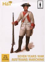 Sets of figures engaged in just one activity have become very popular in recent years, and it is not difficult to see why, since it allows customers, particularly wargamers, to purchase only the poses that they need. The marching pose is always a popular one, and there are many sets dedicated solely to troops on the march, including this, the first of three sets from HaT depicting Maria Theresa’s troops during the Seven Years War. Some dedicated marching sets provide a good variety of poses in similar but subtly different poses to provide a good, natural mix of men as they would actually have appeared, but here we find just three poses, two of fusiliers and one of a grenadier, all for 'German' (i.e. not Hungarian) infantry. As a result, a block of such men would all be identical, which looks smart but is not natural, though for many that is of little consequence. The poses all have their musket on the correct left shoulder, so while very limited in number they are perfectly correct.