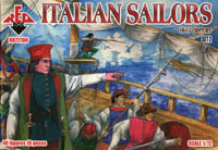 As with Set 1 in this mini series on Italian Sailors, many of the figures in this set are focused on the galley, which reached the height of its importance in the 16th century before rapidly falling from favour. The first four poses pictured above are galley rowers. All have arms close together and hands outstretched, so are presumably pushing or pulling at an oar. Each also has one foot on a step, and two are dressed as Ottoman slaves and are in chains, so clearly rowers. While there are several methods of rowing galleys, none call for the hands to be together like this. The problem of course is that any space between the arms is filled with unwanted plastic, so RedBox have chosen to have the arms as close together as possible, but the natural stance would be to have the arms stretch out directly in front of the shoulder, parallel with each other and with hands apart. So these arm positions are a compromise. The step is a nice touch as galleys usually had such a plank to help the rowers get good purchase while rowing, although it was a good deal higher than the ones modelled here. So not ideal poses, but clearly necessary for any galley model.