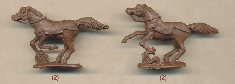 While RedBox horses have been quite variable in quality, and not always particularly good, these are in our view about the worst they have so far made. The anatomy is very poor, and the poses are mostly completely unrealistic. Anyone who could imagine that the last horse in the bottom row could be crossing his legs like a human clearly has never set eyes on such an animal (yes, our picture does not make it clear, but this horse is crossing one leg over the other)! The horse with both right legs on the ground and both left in the air is almost as terrible, and the horse that is touching its belly with one hoof is laughable. If horses could hire lawyers, the makers of these models would be in big trouble. To make matters worse, the fit between man and horse is also very bad. As can be seen, the shape of the men’s legs are not conducive to a decent fit with the animals, and in fact all are either too far apart or too close together (or the horses are too fat or thin – take your pick). All will require gluing to stay mounted, and none look at all realistic when put together. None of the horses have any evidence of a saddle of any kind, and even the bits of random greenery added to help the plastic flow don’t look particularly realistic.