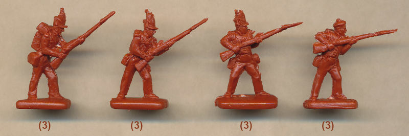 The sculpting of these men is good, with all aspects nicely picked out. The faces are particularly expressive, and detail is reasonable, though sometimes missing such as the pockets (real or false) on the jacket tails, but the drummer’s chevrons and wings are well done. There is a fair amount of flash to be seen, including some quite large tabs, although some of the seams are quite clean, so a very mixed bag. Also there seem to be problems with filling the mould, so on our example the first figure in our row two is virtually missing his left hand, and the same is true of the officer. This feature may vary between copies of the set, and does not greatly detract from the overall appearance, but is still annoying.