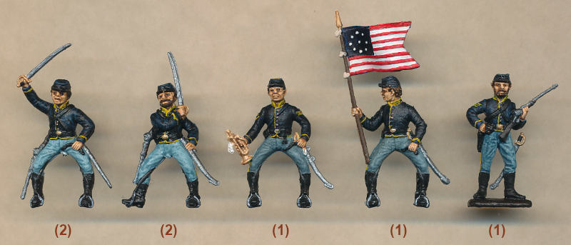 An excellent set which went strangely wrong with the guidon. The bugler has the double chevrons which mark him as a corporal, but one source suggests all buglers were privates. If so then it would be a simple task to trim off the chevrons on both arms to reduce him in the ranks. Purists may wish to substitute the given flag for a more accurate one made of paper, but with very few faults this remains the best Union cavalry set so far made.