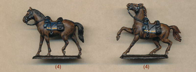 With eleven different poses this is an exceptionally wide selection of cavalry. Some of the men are using firearms and some their sabres, and two are dismounted. With ever better firearms the role of cavalry was changing, and enlightened commanders saw when it was necessary for cavalry to dismount, thus acting more like mounted infantry. The man kneeling firing his carbine has been given no base, and though he does stand he is not as stable without a base, which seems to have been omitted for no good reason. Still, all the poses are good and useful.