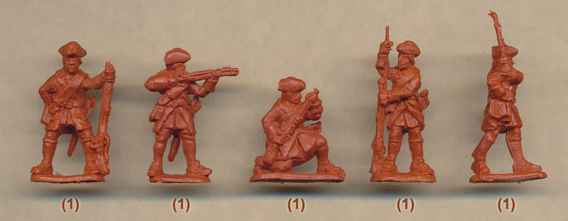 The man biting his cartridge would be very unlikely to have let his musket rest on the ground like that, and the man with the flute or fife is holding it on his left, an unusual arrangement for which there is some evidence, but whether this was the norm is unknown. However this is a set with plenty of interest, and very few blemishes, and it has the advantage of being almost equally good for troops of most other European nationalities of the time given a suitable paint job.