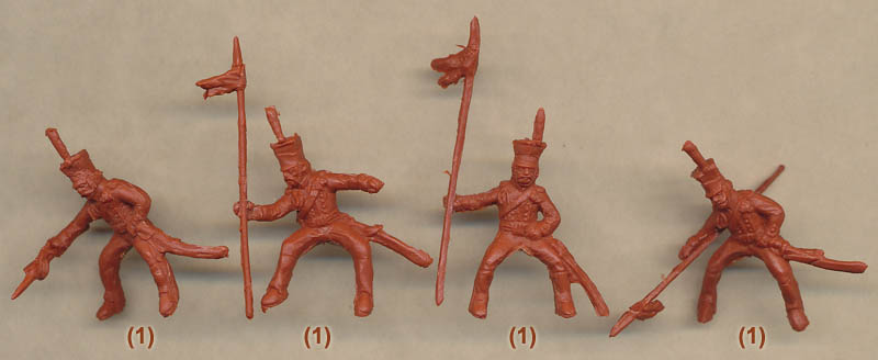 The poses demonstrate a good deal more variety than most lancer sets so far made, but unfortunately one of these are of dubious authenticity. Most are fine, but one man is holding his lance like a javelin, and seems about to hurl it forward, which is only likely to come from frustration or desperation. However he could also be performing part of the little-known manoeuvre by which he turns the lance around to defend against pursuing cavalry behind him. The man with lance tucked under his arm and thrusting it down at his victim is a particularly unusual but worthwhile pose, and the lance is encouraged to stay where it is by fitting a groove along the man's arm. However, like several of his comrades, this join requires gluing as there is no means of support. The lances themselves are about 3 metres in length, which is good, and reasonably straight (which is an improvement on some previous sets from this manufacturer), though they do require some trimming as they are joined to the sprue in many places. Several of the lancers have drawn swords, which might suggest that they have lost their lances, and one is using the pistol with which they were all issued. A very good selection.