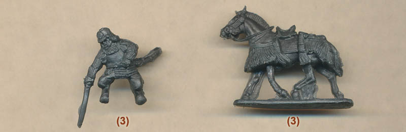 The two mounted men are both armed and armoured in the traditional manner, but here the problem is that they fail to sit on their horses - their legs are just too close together to fit. The man wearing a jinbaori surcoat has his scabbard hanging down in the European fashion, which is incorrect. The horses themselves are unarmoured and correctly saddled and decorated with tassels and the like.