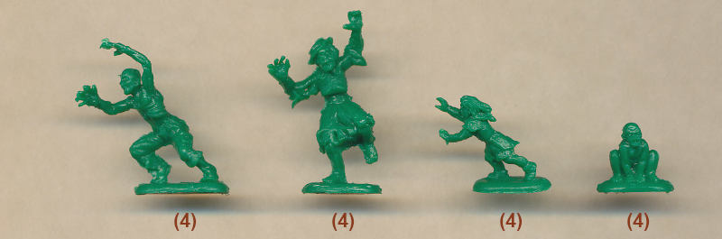 The standard of sculpting is the same as with the first set, which is very good. The ghoulish faces are again well done, and we find the emaciated bodies and torn clothing repeated here. The second figure in the top row is quite amusing as it appears to show an elderly woman wearing a dress and brimmed hat that probably looked quite charming while she was alive, and seem slightly incongruous now she is undead. Again the outstretched fingers have not been very successful, but otherwise the figures look good and the poses are lively and menacing. Flash is fairly low-level but there are also large tabs such as on the baby at the end of the second row. These much more mobile and so more terrifying zombies are a recent invention, but have quickly found their place in the world of fantasy literature, media and games, and with this set they make a good introduction to 1/72 scale plastic figures too.