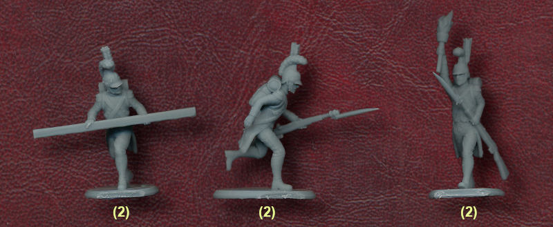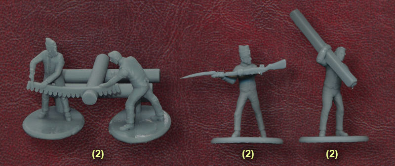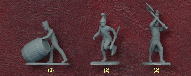 A set of engineers, or sapeurs, naturally presents plenty of opportunities for some very different poses from the usual military ones. A couple of the ones offered here are handling large pieces of wood, and there is a great tableau of men using a two-handed saw to slightly shorten a log. There is also a running man with an axe, and another swinging one. The man handling the large barrel really appealed to us, which leaves three men with muskets. We couldn’t decide what to make of the figure in the top row holding a musket horizontally, but the two in the bottom row are moving about, and since they are carrying their weapon, perhaps they are expecting some fighting rather than manual work. The last figure is also carrying a torch, but all the poses are really interesting, and apart from the mysterious man in the top row, we liked them all a lot.